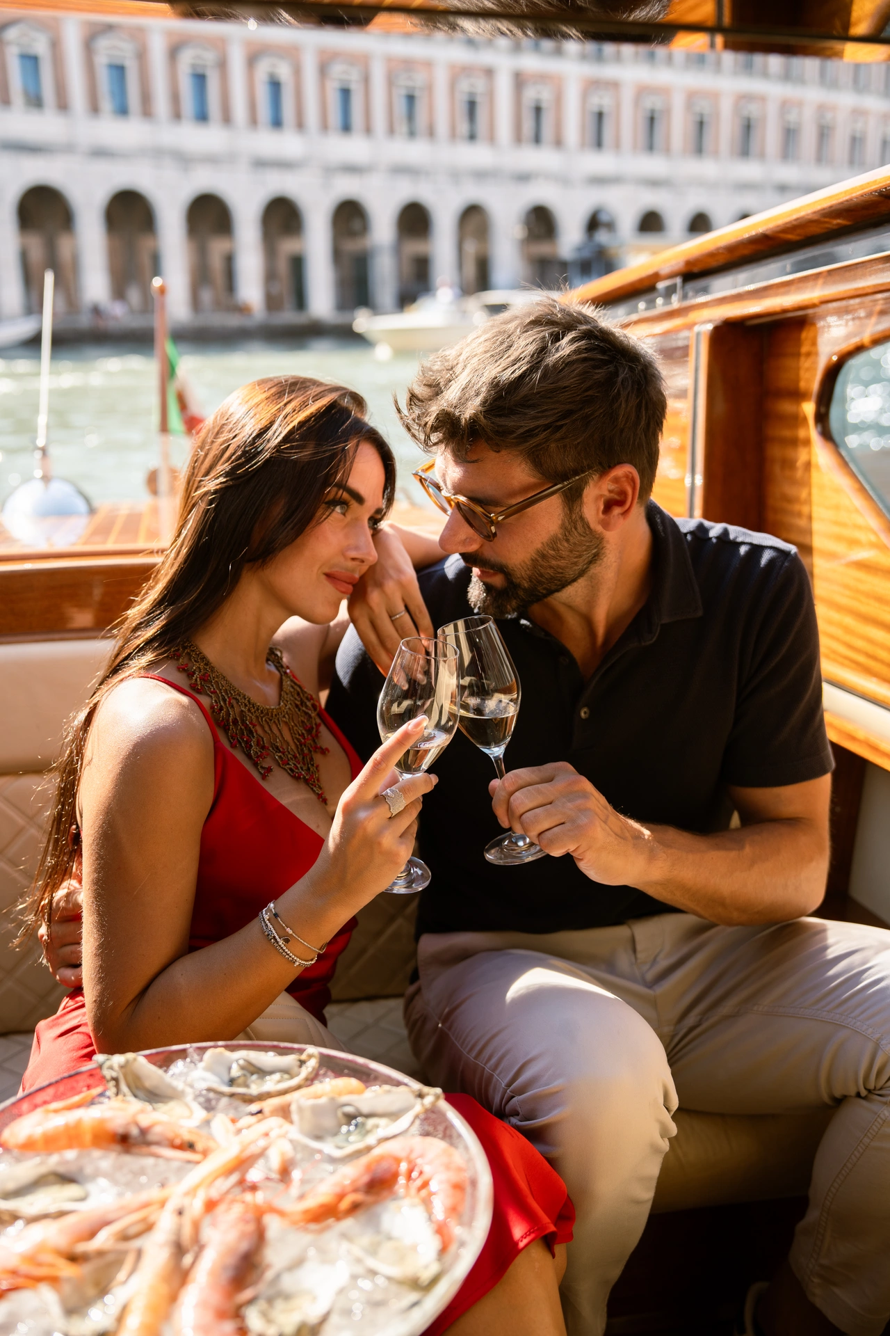 Experience Venice from within, among historic canals and a private Murano, aboard an iconic boat. Gourmet lunch prepared by Michelin-starred chefs and aperitif with oysters and crudités at sunset, immersed in the golden reflections of the lagoon.